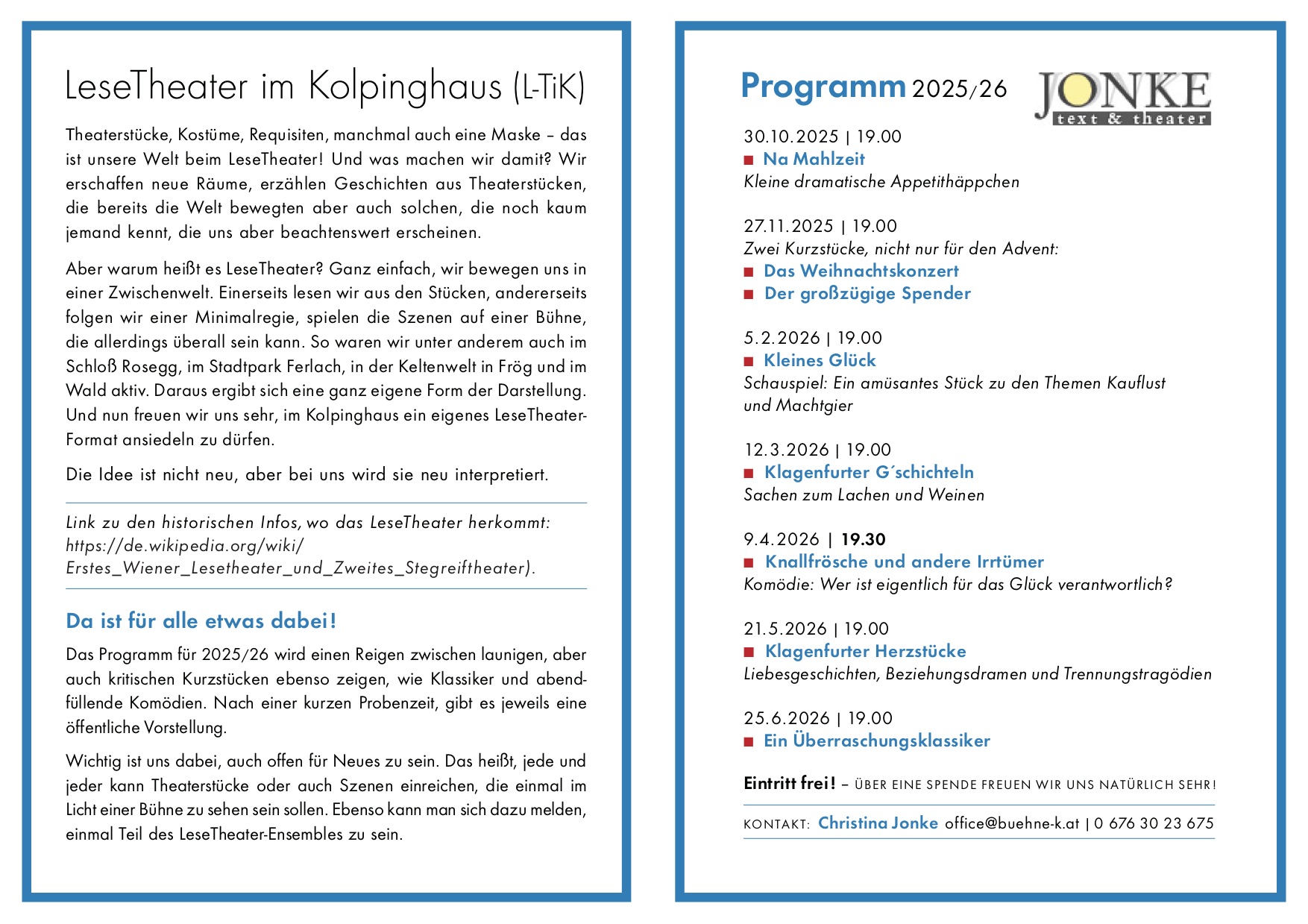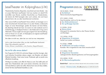 Es gibt etwas Neues. Im Kolpinghaus Zentral. Die LeseTheater-Saison beginnt mit Oktober 2025 und endet im Juni 2026 – vorerst. An sieben Abenden wird das Ensemble des LeseTheaters im Kolpinghaus heitere, spaßige und nachdenkenswerte Theaterhäppchen servieren. Dazwischen wird daran gearbeitet, dass die Texte gut rüberkommen.